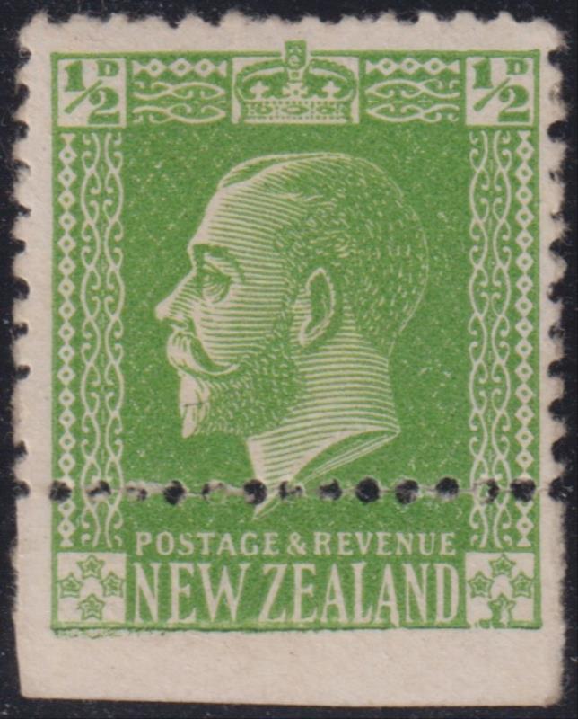 1927 ½d GV yellow-green , p14, Cowan paper. Variety misperforated/partly imperf, horiz perf strike at bottom misplaced approx