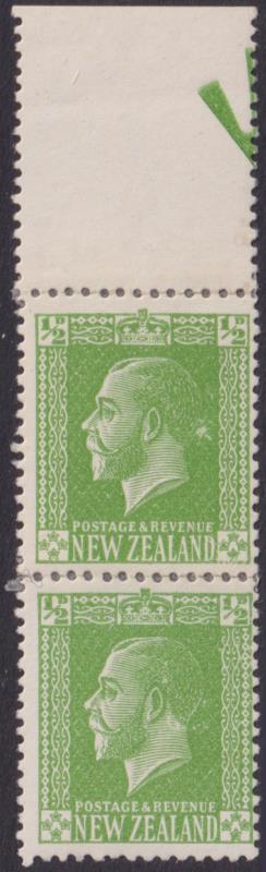 1927 ½d GV yellow-green vert pair, p14, Cowan paper, with sheet selvedge at top. Narrow transparent official patching applied