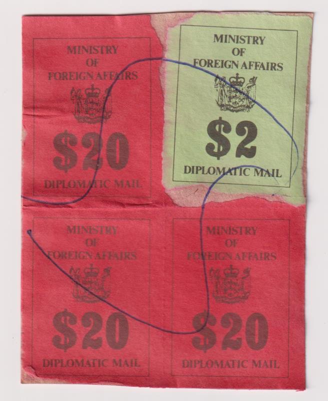 Ministry of Foreign Affairs 1988 $20 x 3 + $2 Diplomatic Mail, used on piece. (Image)