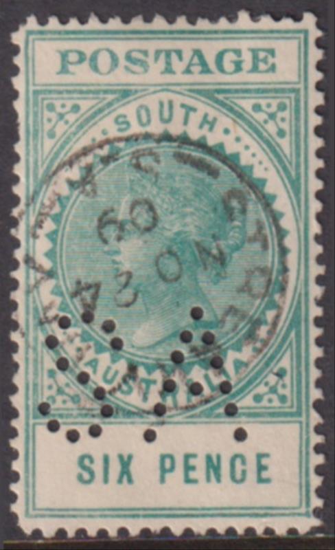 1987 U imageSouth Australia 1906 6d QVLT blue green, p12, "SA" puncture. BW cat A$75. VFU. (Image)