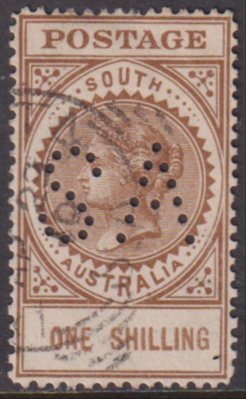 1988 U imageSouth Australia 1906 1/- QVLT brown, p12, "SA" puncture. BW S59bc. Cat A$50. FU. (Image)