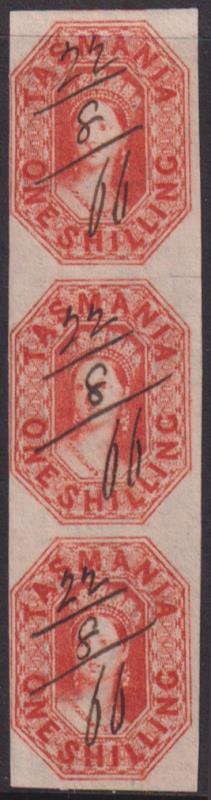 1993 F imageTasmania 1858 1/- QV vermilion imperf vert strip of 3, wmk double-lined "12", each with "22/8/66" fiscal m/s cancel & 3 margins (cut right to frame on 4th side, at left). SG 41. Cat £285 as postally used. (Image)