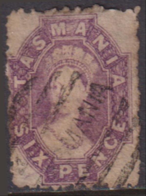 1994 U imageTasmania 1865 6d QV reddish mauve, p12. SG 76. Cat £45. GU. (Image)
