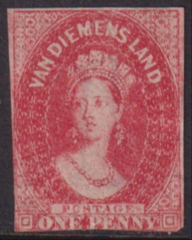 1995 M imageTasmania 1867 1d QV carmine, imperf about 2½ margins, "Van Diemen's Land" double-lined wmk. SG 29. Cat £400. Unused, mint no gum. (Image)