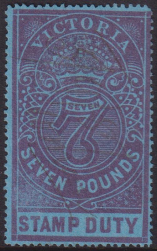 2000 FU imageVictoria 1884 £7 Stamp Duty violet on blue, p11, upright V over crown wmk (type W19). Fiscally used (faint traces visible of cleaned m/s cancel). Fine appearance. SG 250. Cat £225. (Image)