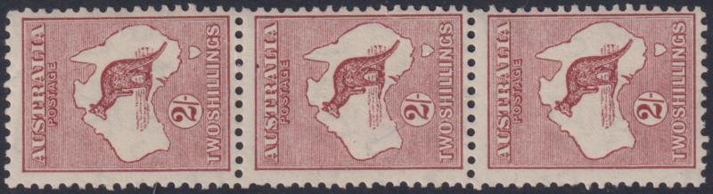 1935 2/- Roo maroon vert strip of 3, C of A wmk from plate 2 lower position. Top stamp flaw in gulf retouched (2L 39) & lower