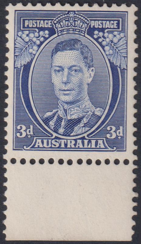 1938 3d GVI blue, Die II, with lower selvedge. SG 168c. Cat £60. MUH. (Image)