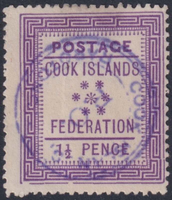 Cook Isl 1892 1½d Federation bright mauve, canc complete "Cook Islands/Rarotonga/P.O." double-circle cancel. SG 2. Cat £40.