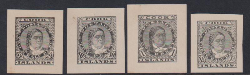 Cook Isl 1893 1d, 1½d, 2½d & 10d Makea 4 die proofs in black on cream paper. (Image)