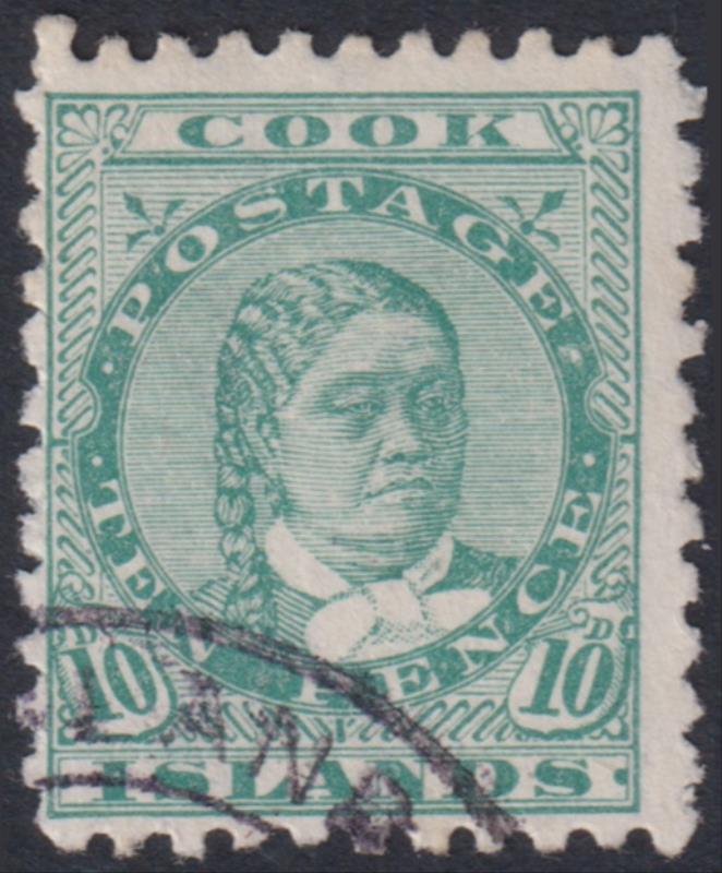 Cook Isl 1896 10d Makea green, p11, upright wmk. SG 19. Cat £55. FU. (Image)