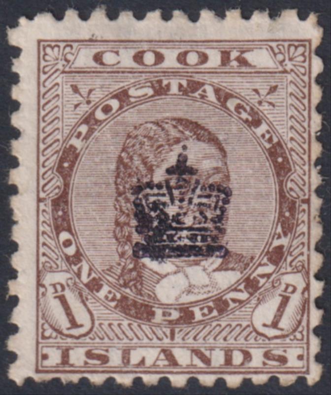 Cook Isl 1901 1d Makea brown, p11, with black crown ovpt. Part gum only, otherwise fine. SG 22. Cat £190. (Image)