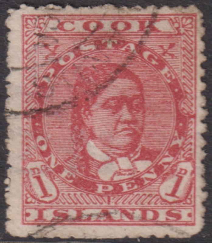 Cook Isl 1909 1d Makea deep red, p14, invtd wmk. SG 38. Cat £35. FU. (Image)