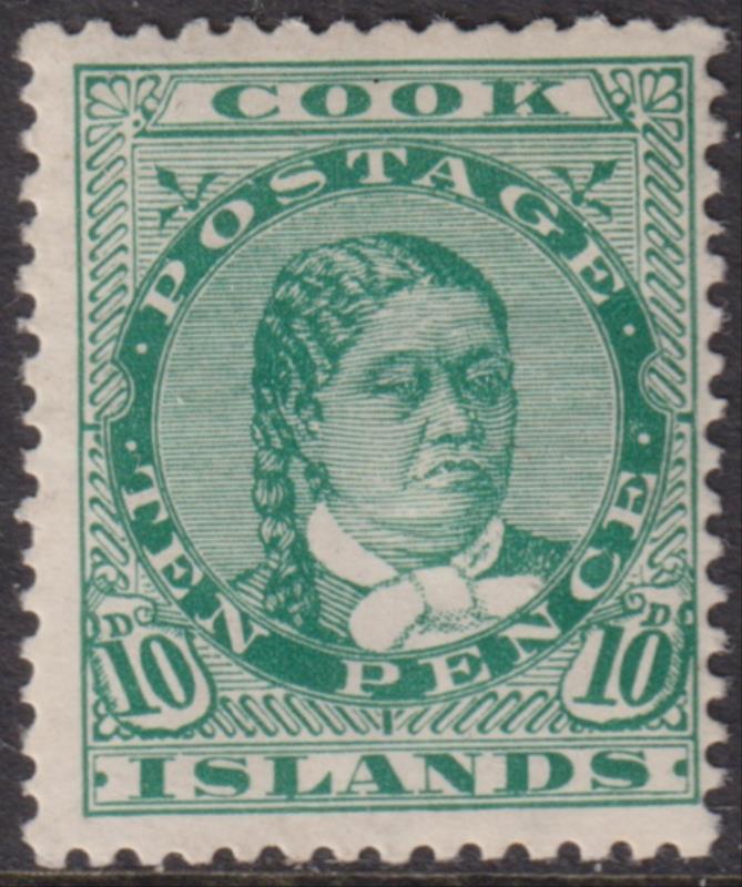 Cook Isl 1918 10d Makea green, p14 x 15. SG 45. Cat £40. Mint. (Image)