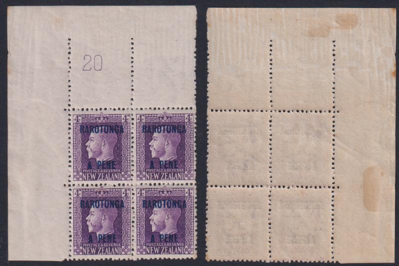 Cook Isl 1919 4d GV plate block of 4 - No. 20. Several small tone spots. NZ equivalent cat $850. (CP). Hinged on