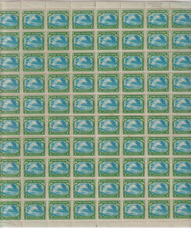 Cook Isl 1945 3/- Native Canoe complete sheet of 80 (10 x 8), mult wmk upright, tropicalised gum. SG 145. Cat £3360+.