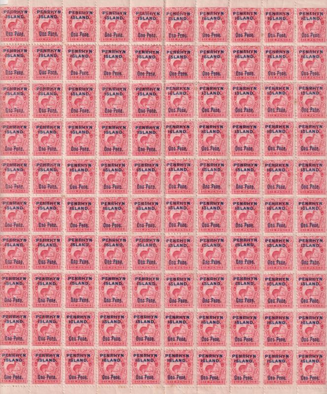 2266 * imagePenrhyn 1903 6d Kiwi complete sheet of 120, 1 vert sheet fold, small part selvedge missing at top, gum tone spots affect about 50%. Top row variety "imperf at top". SG 15. Cat £1920. MUH. (Image)