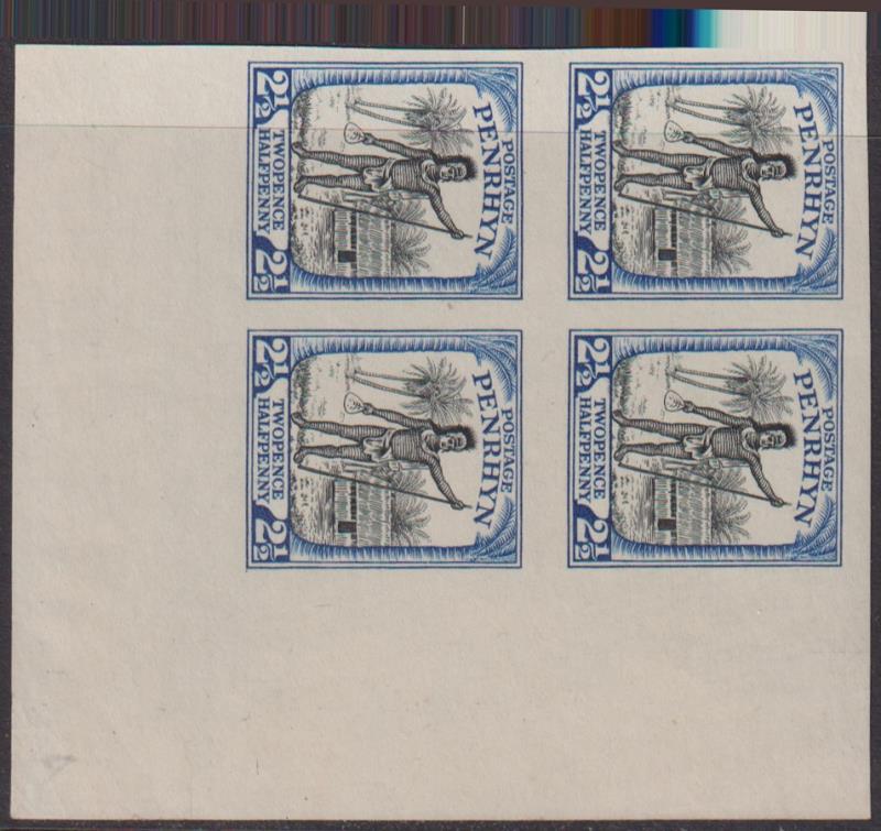 2269 P imagePenrhyn c1927 2½d Chief lower RH corner imperf plate proof blk of 4, black & blue, no wmk paper. (Image)