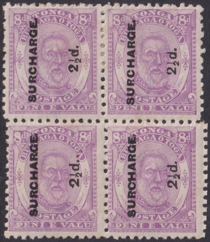 Tonga 1894 2½d on 8d King George I mauve block of 4 with damaged/defective ''2'' of ''2½'' on 2nd & 4th stamp. SG 23, 23 var.