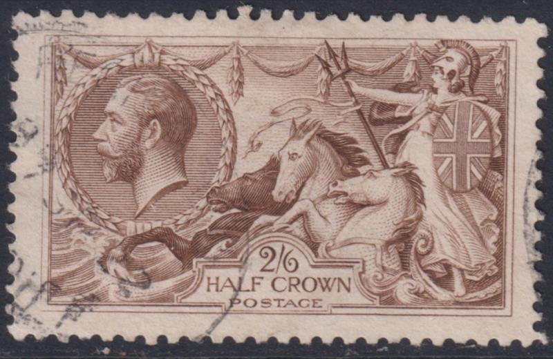 1918 2/6d Seahorses chocolate-brown, BW printing. SG 414. Cat £65. FU. (Image)