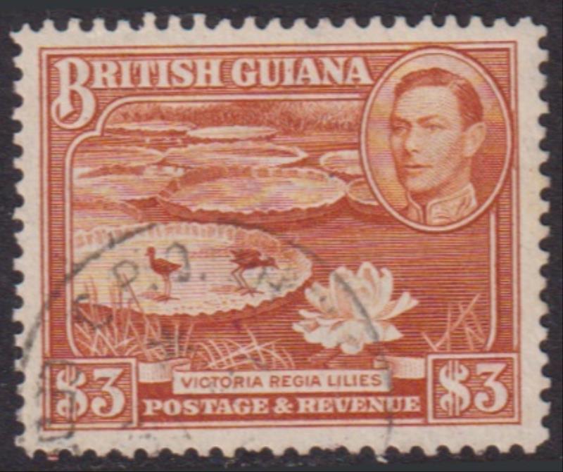 2553 U imageBritish Guiana 1945 $3 GVI Water Lilies. SG 319. Cat £45. FU. (Image)