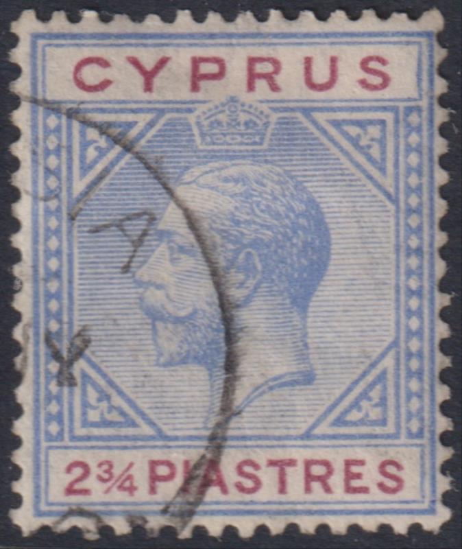 Cyprus 1921 2pi GV blue & purple, mult script CA wmk. SG 92. Cat £30. FU. (Image)