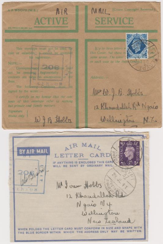 2683 C imageEgypt-S Africa 1941 WWII OAS green "Active Service" printed "honour" envelope, by air to NZ, with GB GVI 10d canc fine "EGYPT POSTAGE PREPAID" cds, (with code "37") 9 AU 41 (this cds used in N Africa by S African forces). Fine boxed censor No 206 h/s. A (Image)