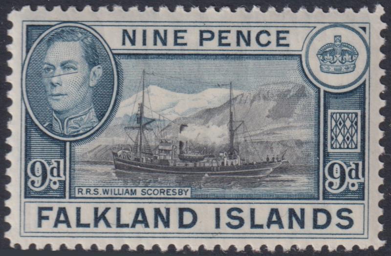 2686 M imageFalkland Isl 1938 9d GVI Ship. SG 157. Cat £28. Mint. (Image)