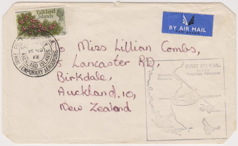2689 C imageFalkland Isl 1972 air cover ex Stanley to NZ, franked 1971 5p Diddle Dee Bush, SG 283, canc good near complete strike of special 3-ring cds "First [outward?] Airmail / From Temporary Aerodrome / Port Stanley / Falkland Islands" 15 NO 72. Also with commem (Image)