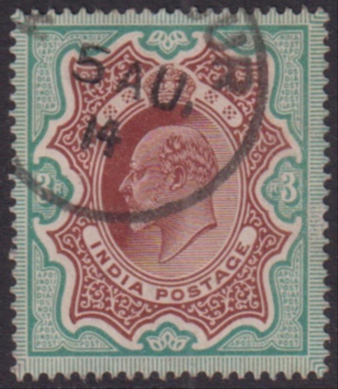2772 U imageIndia 1911 3r EVII brown & green, dated cds 5 AU 14. SG 140. Cat £42. FU. (Image)