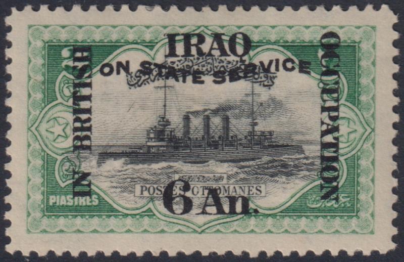 2784 M imageIraq 1920 6A "In British Occupation / On State Service" ovpt on Turkey 2P Warship black & green. SG O25. Cat £55. Mint. (Image)