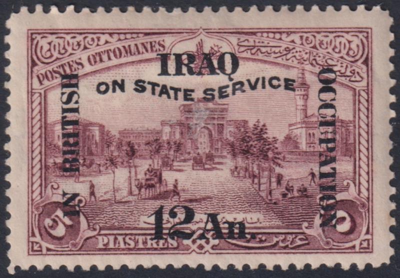 2787 M imageIraq 1923 12A "In British Occupation / On State Service" ovpt on Turkey 5P Ministry of War purple, p12, mult script CA wmk. SG O39. Cat £50. Mint. (Image)