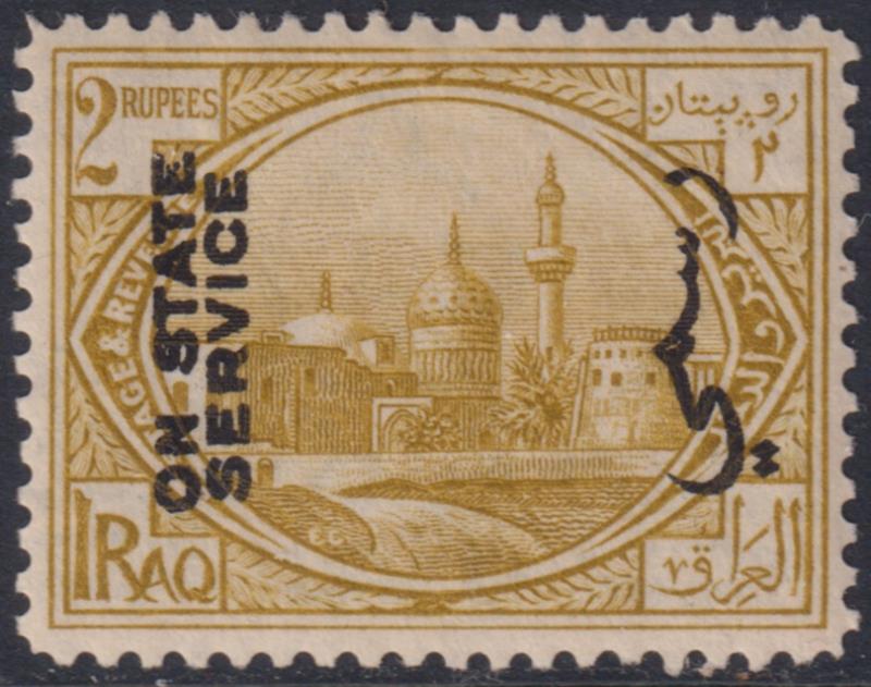 2789 M imageIraq 1925 2R Mosque olive-bistre official, p14, mult script CA wmk, with bilingual "On State Service" ovpt sideways. SG O75. Cat £55. Mint. (Image)
