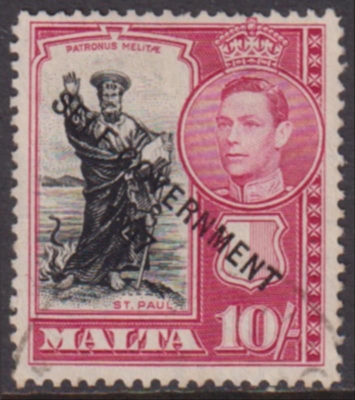 2862 U imageMalta 1947 10/- St Paul & GVI, Self Government / 1947 ovpt. SG 248. Cat £30. FU. (Image)