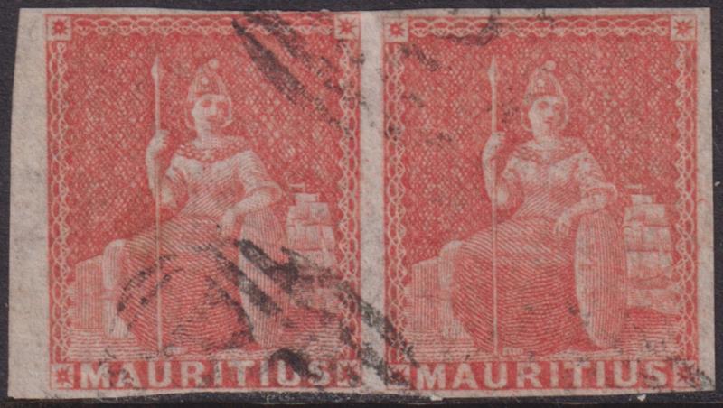 2867 U imageMauritius 1858 (6d) Seated Britannia vermilion horiz pair (both 4 margins). SG 28. Cat £240. FU. (Image)
