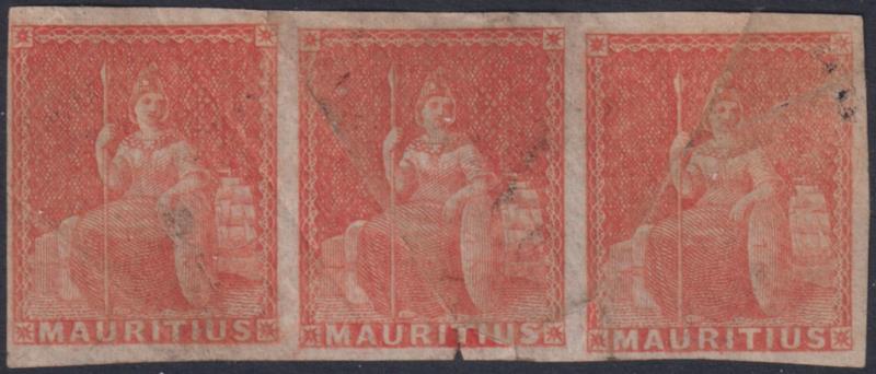 2868 M imageMauritius 1858 (6d) Seated Britannia vermilion horiz strip of 3 (each with 4 margins), but some faults, scruffy appearance. A scarce multiple. SG 28. Cat £210. MNG. (Image)
