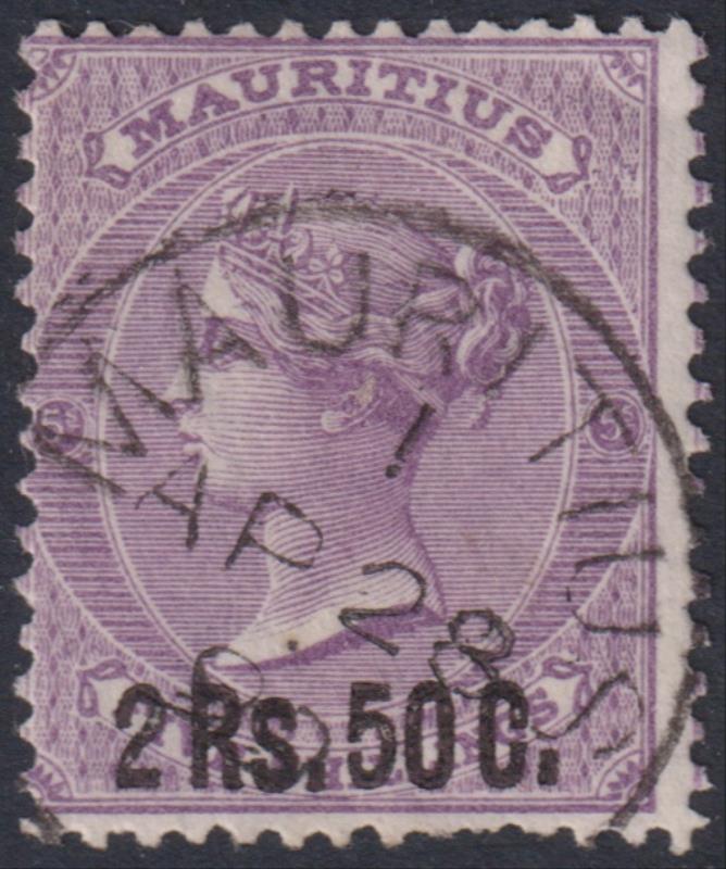 2869 U imageMauritius 1878 2R50 on 5/- QV, cds. SG 91. Cat £38. FU. (Image)