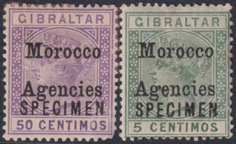 2878 S imageMorocco Agencies 1899 5c & 50c QV, SPECIMEN, latter thinned lower RHS. SG 9s, 14s. (Image)