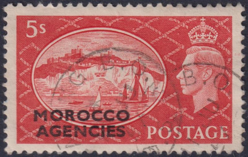 2881 U imageMorocco Agencies 1951 5/- GB GVI red (Cliffs of Dover) with ovpt. SG 100. Cat £30. FU. (Image)
