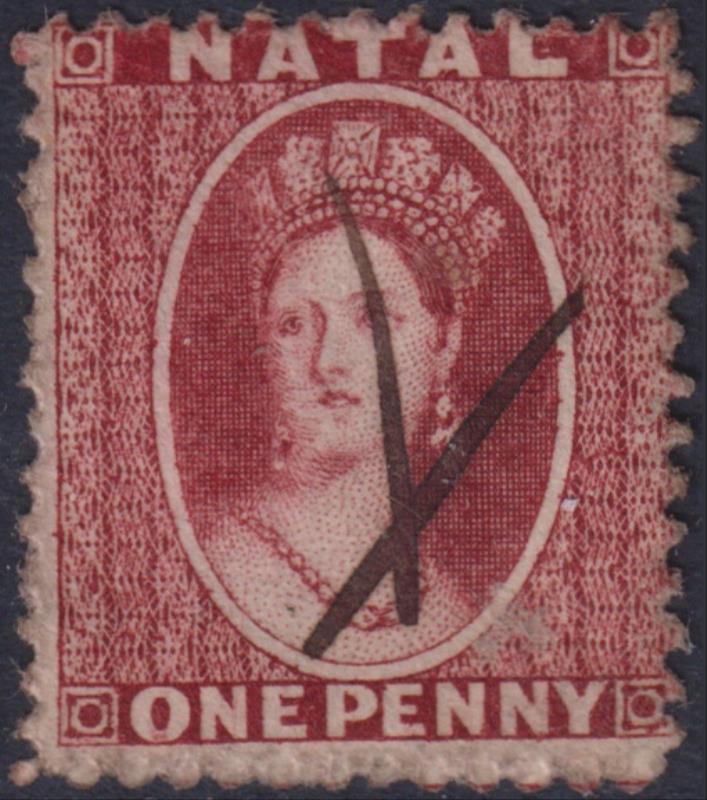 2886 U imageNatal 1863 1d QV lake, no wmk, p13. SG 18. Cat £40. Used ("X" m/s cancel). (Image)
