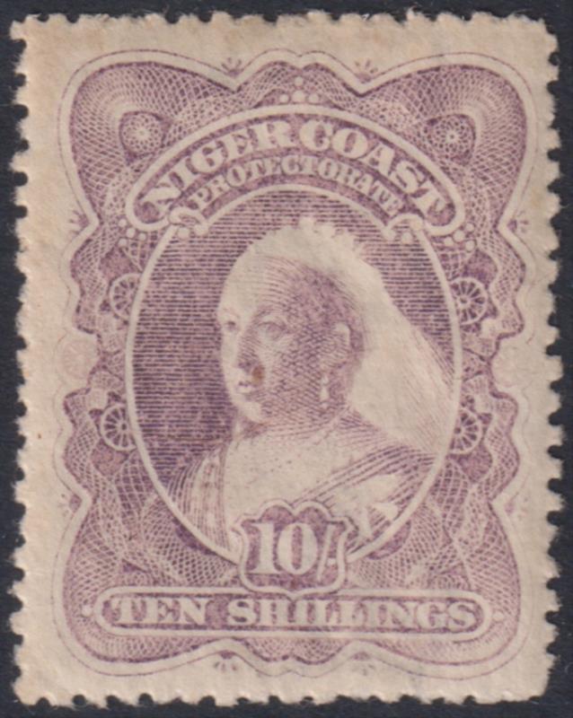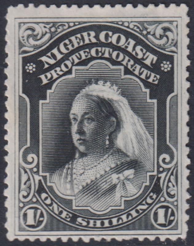 2894 M imageNiger Coast 1894 1/- QV black, p14½, no wmk, top value. SG 56. Cat £85. Unused no gum. (Image)