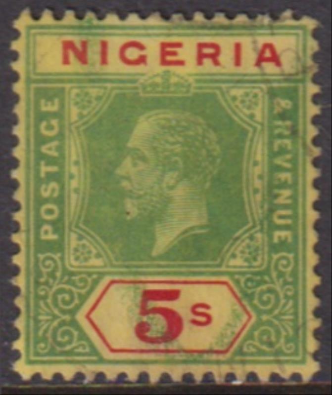 2900 U imageNigeria 1914 5/- GV red & green on yellow (lemon back), mult crown CA wmk, light blue regn line. SG 10a. Cat £65. FU. (Image)
