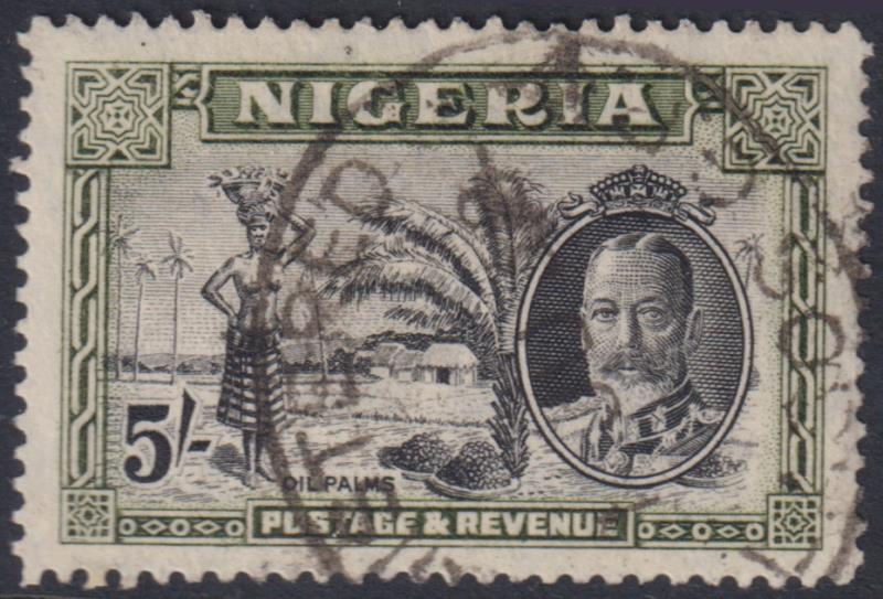 2904 U imageNigeria 1936 5/- GV & Oil Palms black & olive-green. SG 43. Cat £65. FU. (Image)