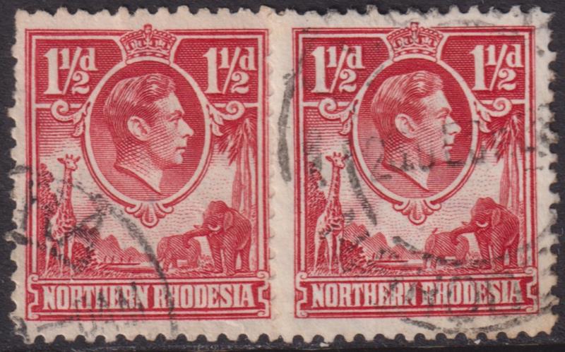 2917 U imageNorthern Rhodesia 1938 1½d GVI & Animals, variety "tickbird" flaw, with normal for comparison. SG 29b. Cat £450. FU. (Image)