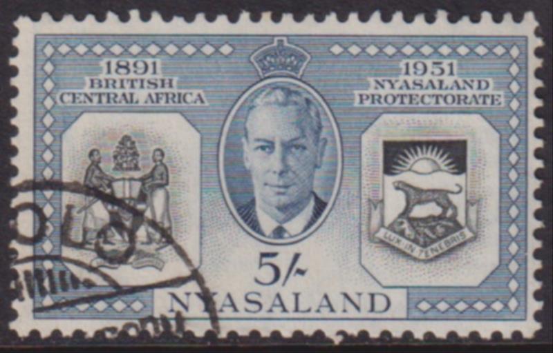 2926 U imageNyasaland 1951 5/- Diamond Jubilee of Protectorate. SG 170. Cat £20. FU. (Image)