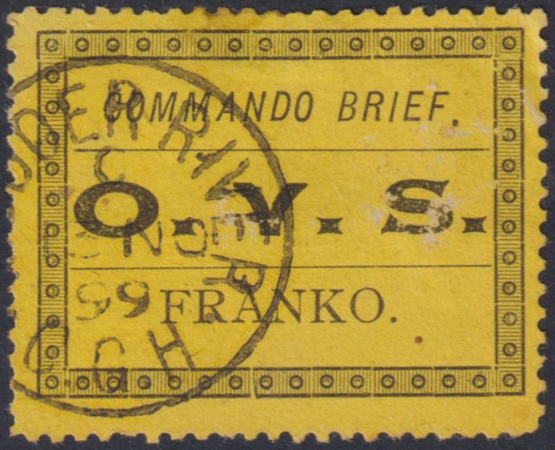 2928 U imageOrange River Colony 1899 Military Frank "Commando Brief" stamp issued to members of the O.F.S. army on active service during the 2nd Boer War, with Modder River cancel. SG M1. Cat £60. FU. (Image)