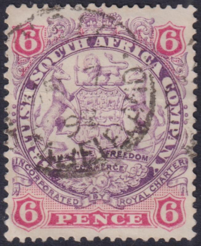 2937 U imageRhodesia 1896 6d Coat of Arms, Die I. SG 33. Cat £32. FU. (Image)
