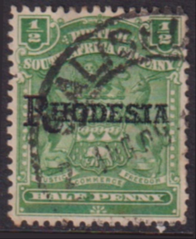 2940 U imageRhodesia 1909 ½d Arms green of Br. S. A. Co ovptd "Rhodesia" with no stop after Rhodesia. SG 100a. Cat £50. FU. (Image)