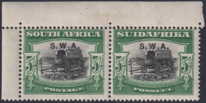 3004 * imageSouth West Africa 1927 5/- Ox Wagon outspanned horiz bilingual pair (with top selvedges which are hinged). SG 66. Cat £75. MUH. (Image)