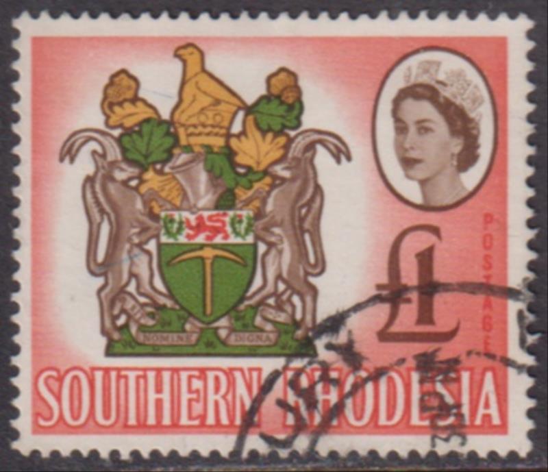 3013 U imageSouthern Rhodesia 1964 £1 QEII & Coat of Arms. SG 105. Cat £25. FU. (Image)