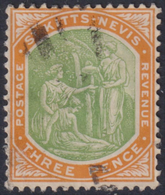3018 U imageSt Kitts-Nevis 1903 3d Medicinal Spring green & orange, crown CA wmk. SG 5. Cat £30. GU/FU. (Image)